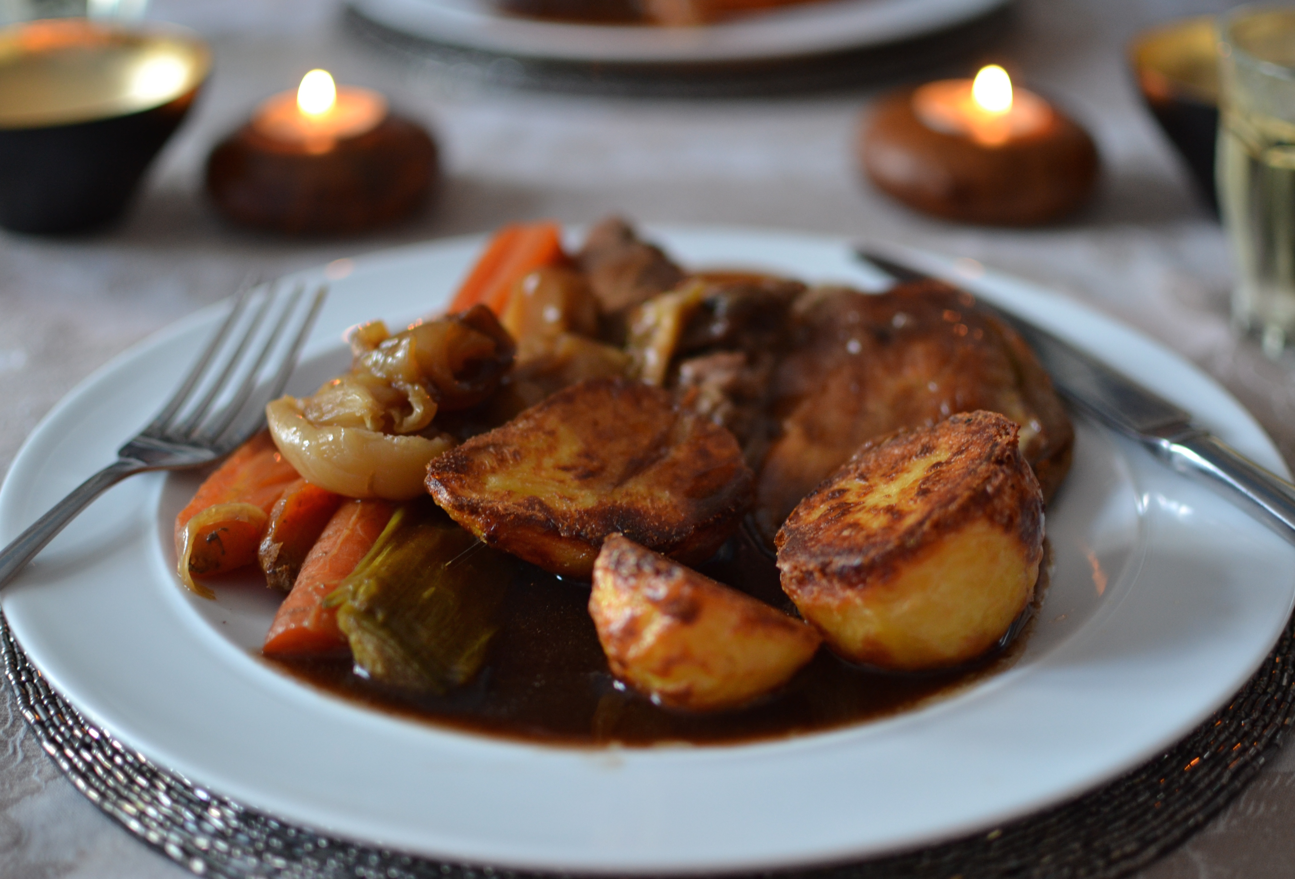 Then slow roast lamb with carrots, leeks and onions braised beneath the lamb, and roast spuds…
