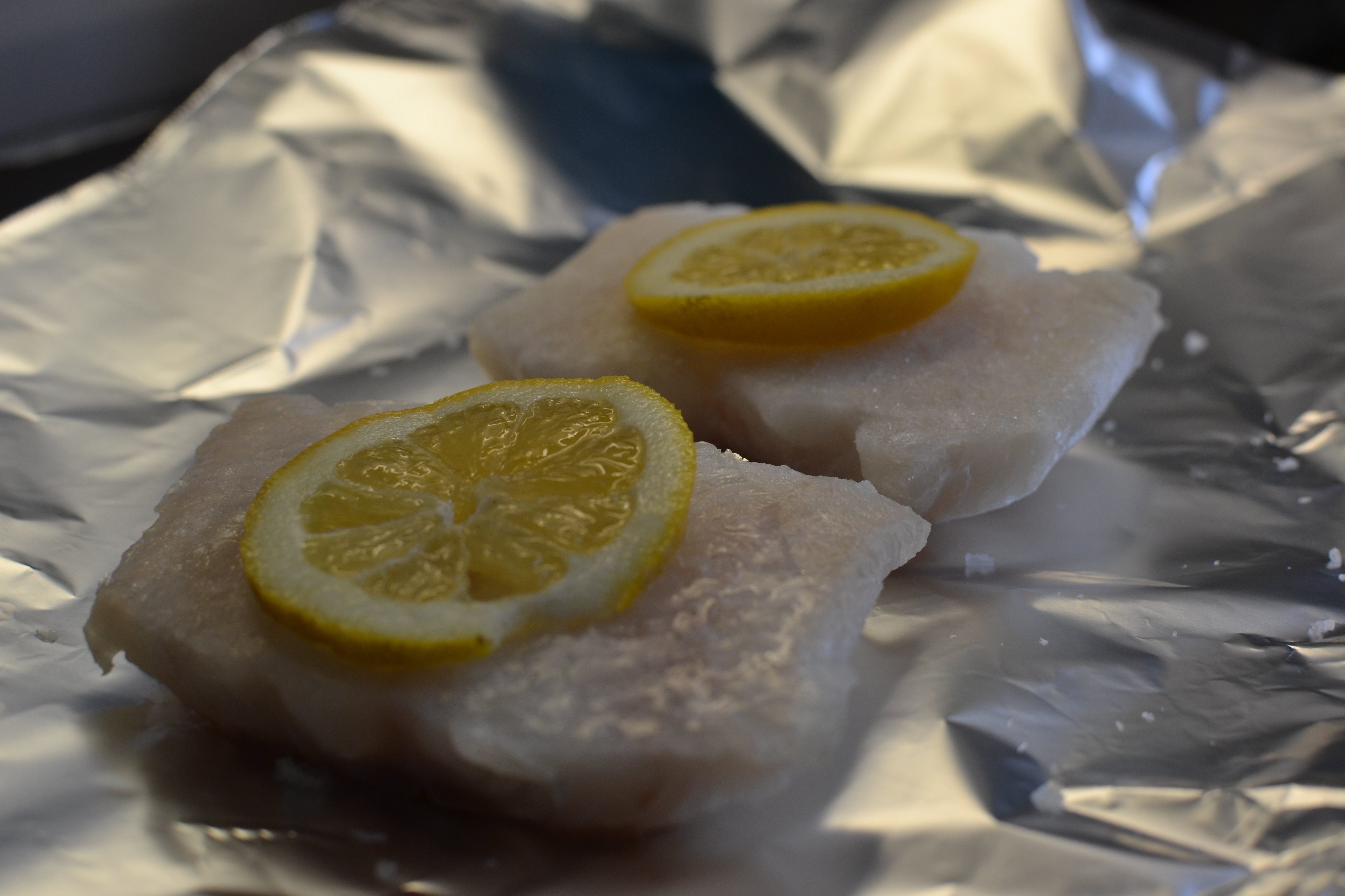 Put your fish in the oven at 180C for as long as directed to. I used frozen cod fillets which the packaging said needed to go in for 30 minutes. I found they were over done. If baking from fresh, I’d say 10-15 minutes is plenty. I put slices of lemon on them and wrapped in tin foil.