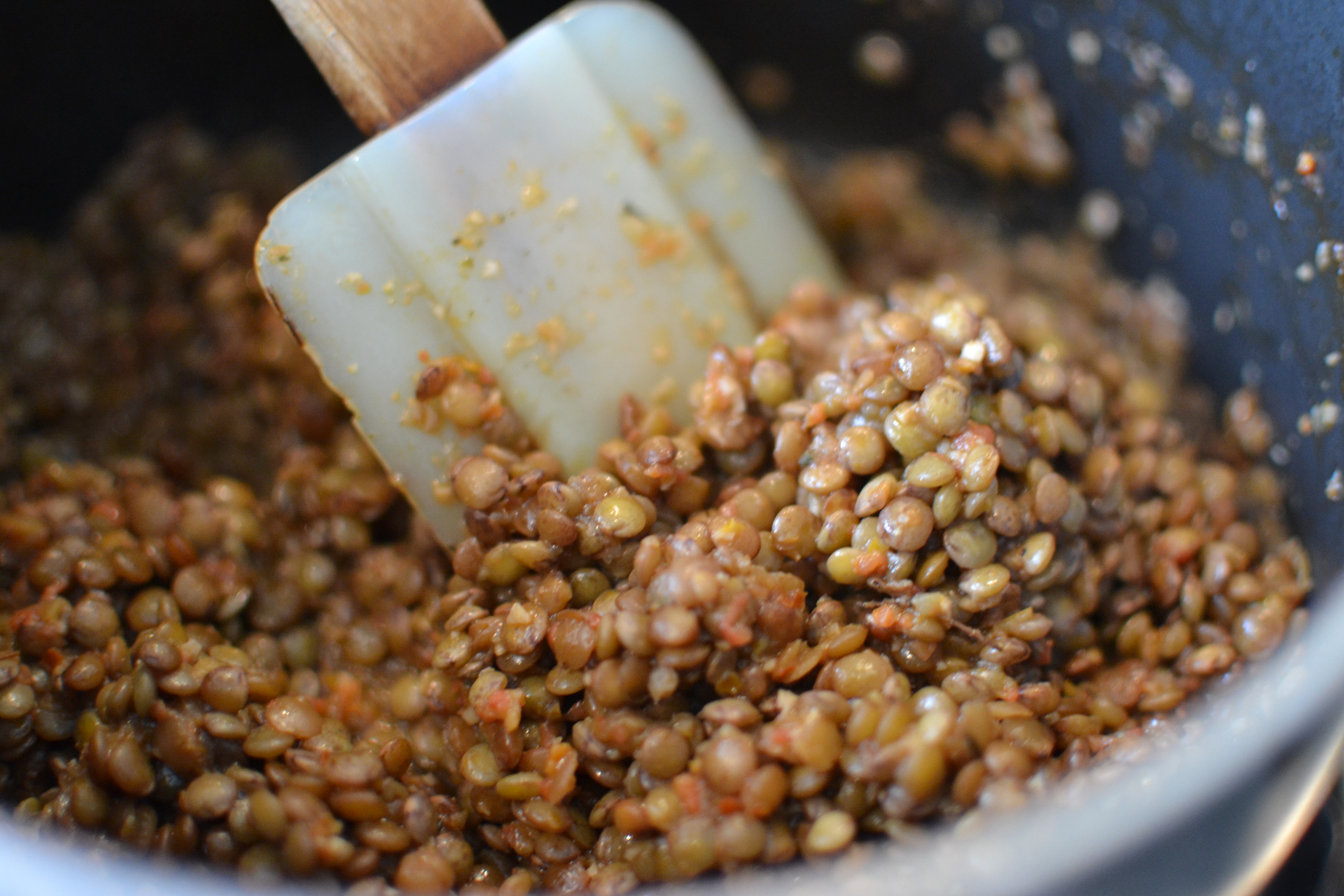 Then I blended the cherry tomatoes, garlic, some olive oil and lemon juice, and added the mix to the pan. Stir well and continue to cook until the liquid has reduced and the lentils have taken on the lovely winey, tomatoey, herby, garlic flavours. Test the lentils as you go – they’re meant to be al dente but if you find them a bit hard, add some more water until you’re happy.
