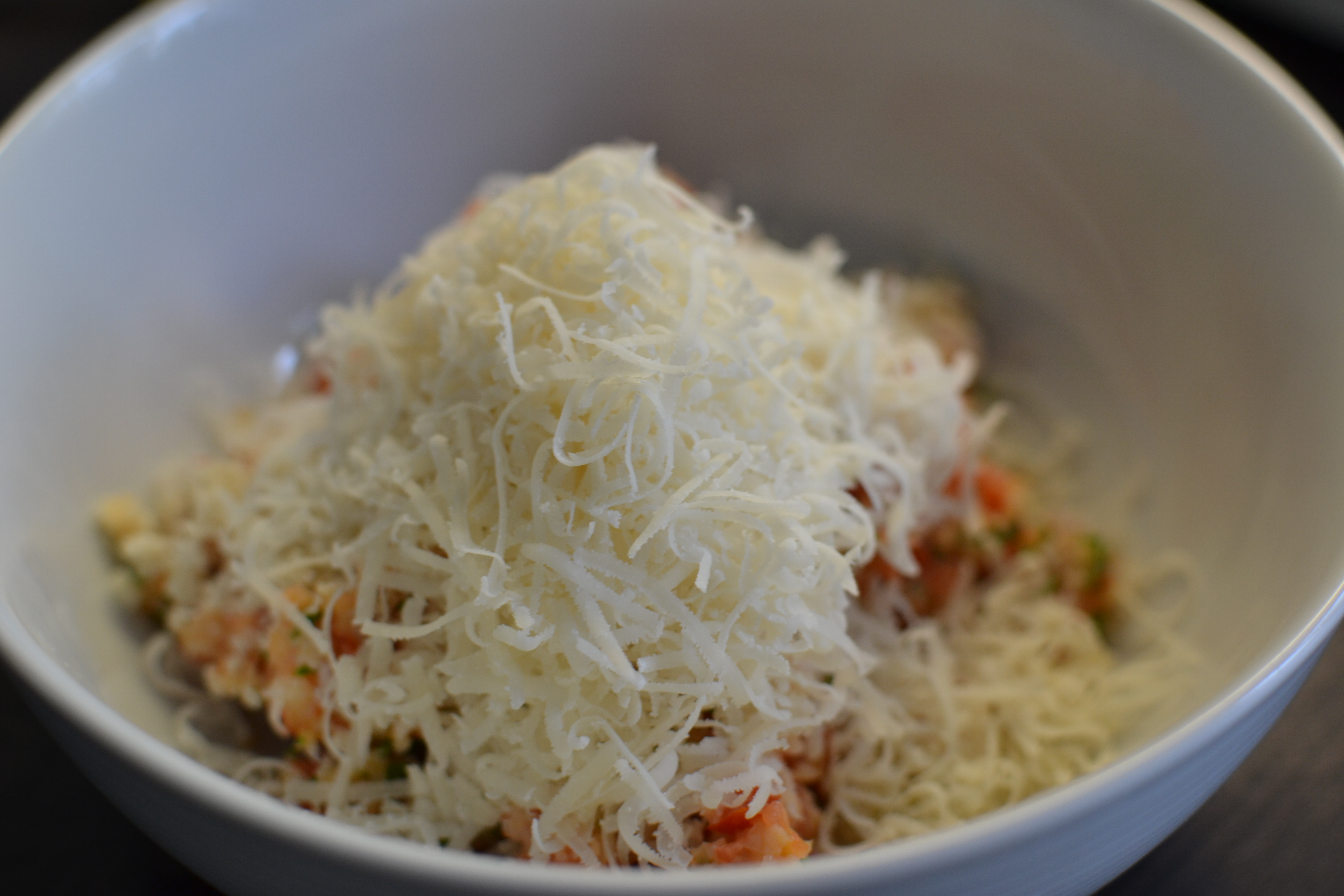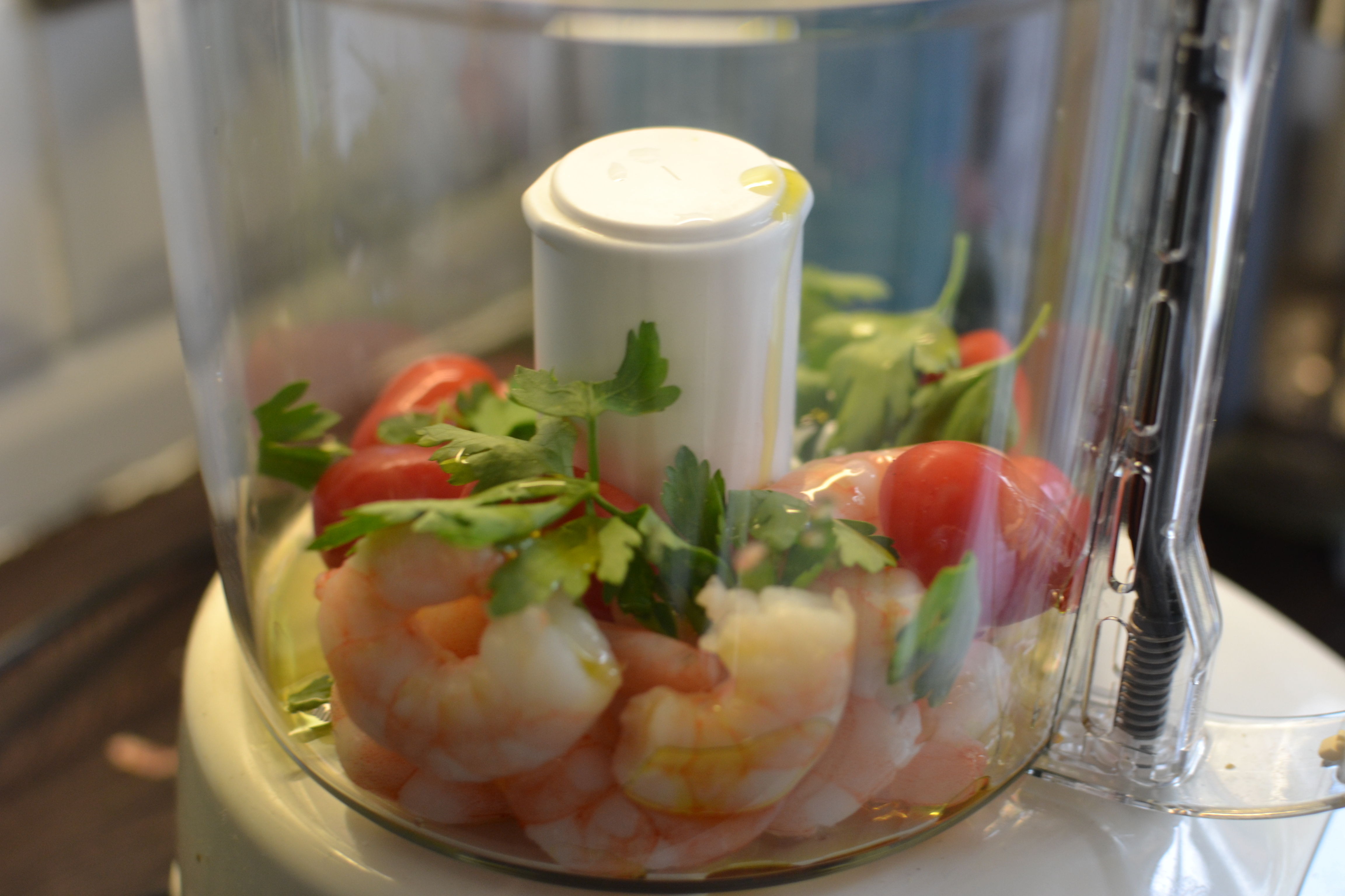 Put the tomatoes, prawns, parsley and olive oil into a blender and blitz. Scrape out into a bowl and mix in the breadcrumbs, parmesan, salt and pepper.