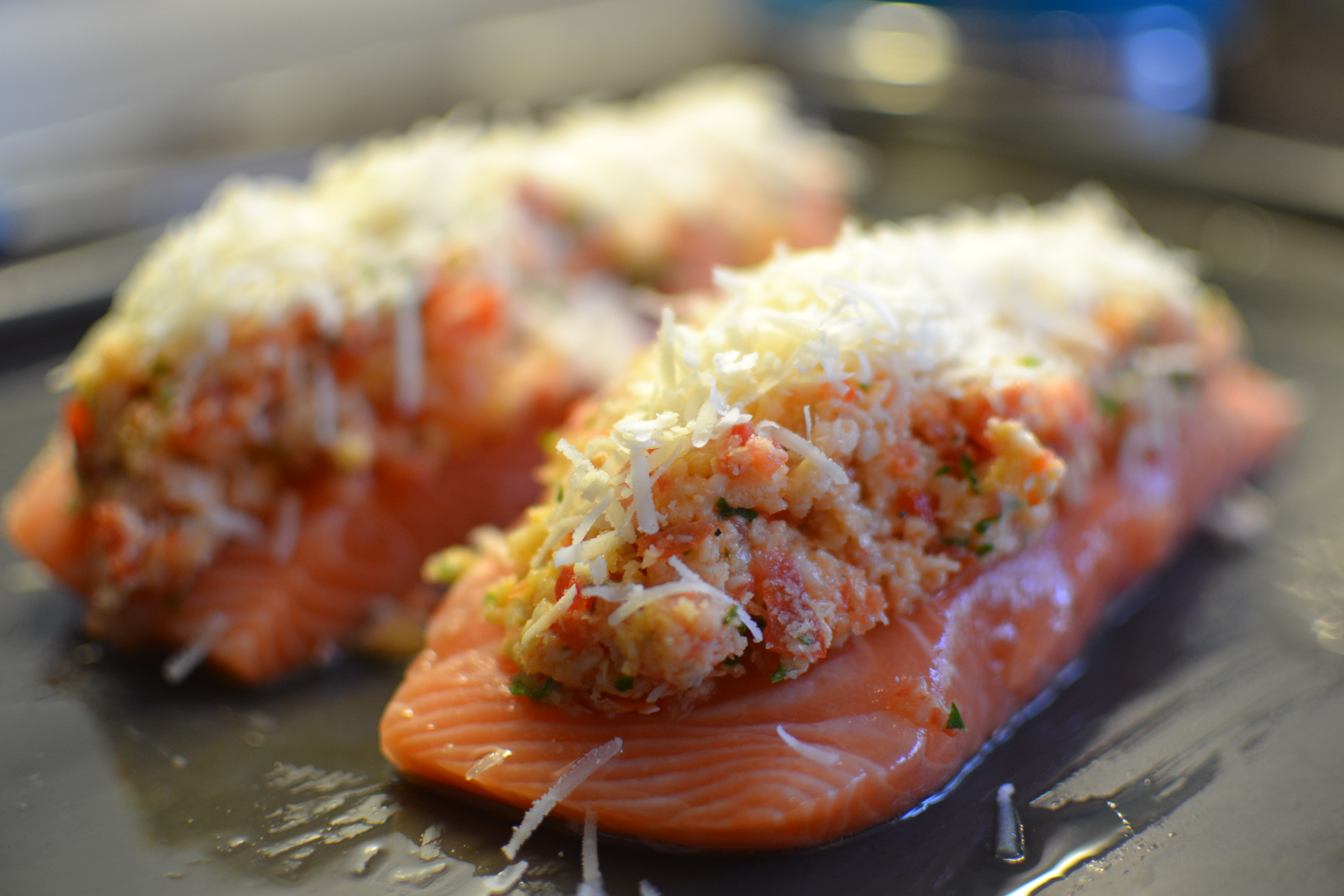 Put the salmon onto an oiled baking sheet. Spoon the crust onto the salmon and squash down into place. You can sprinkle a bit more parmesan on top if you’re feeling cheesy. Put into the oven for 25 minutes or until it has browned and you’re happy with it (some people like salmon less well done).