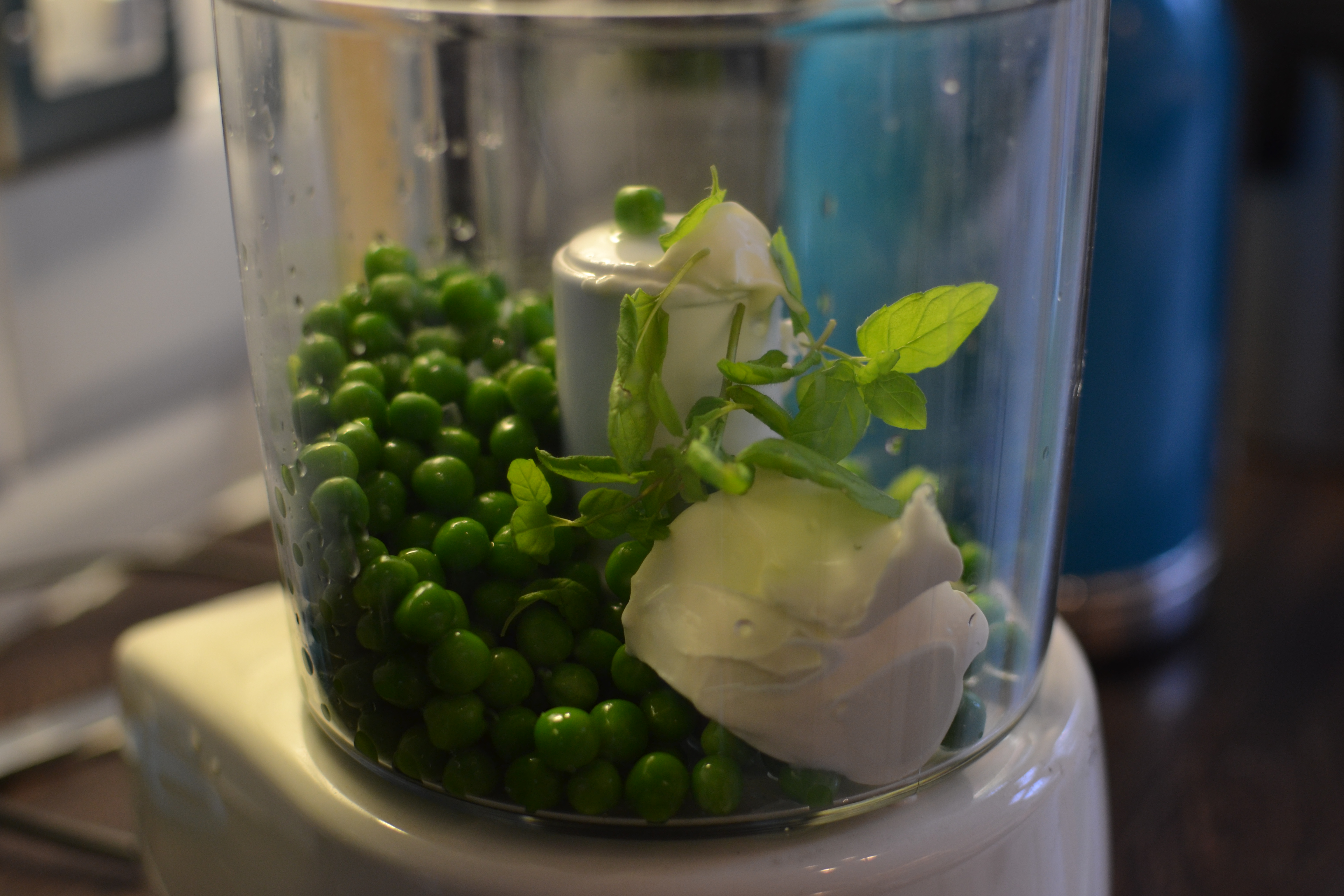 Put the peas, mint leaves, creme fraiche, salt and lemon into the blender. Pulse until broken down into a bit of a mush but still with some solid pieces / bite.
