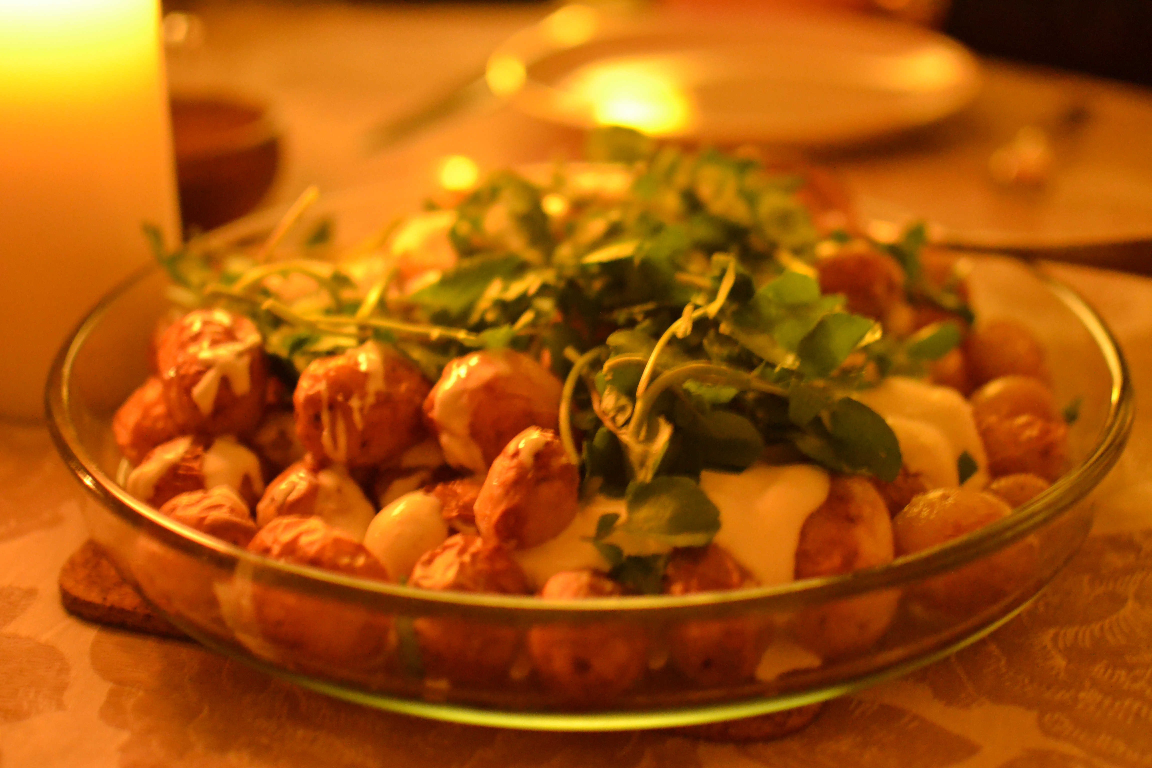 When you’re ready to serve, spoon the garlicky cream over the potatoes, and garnish with watercress.