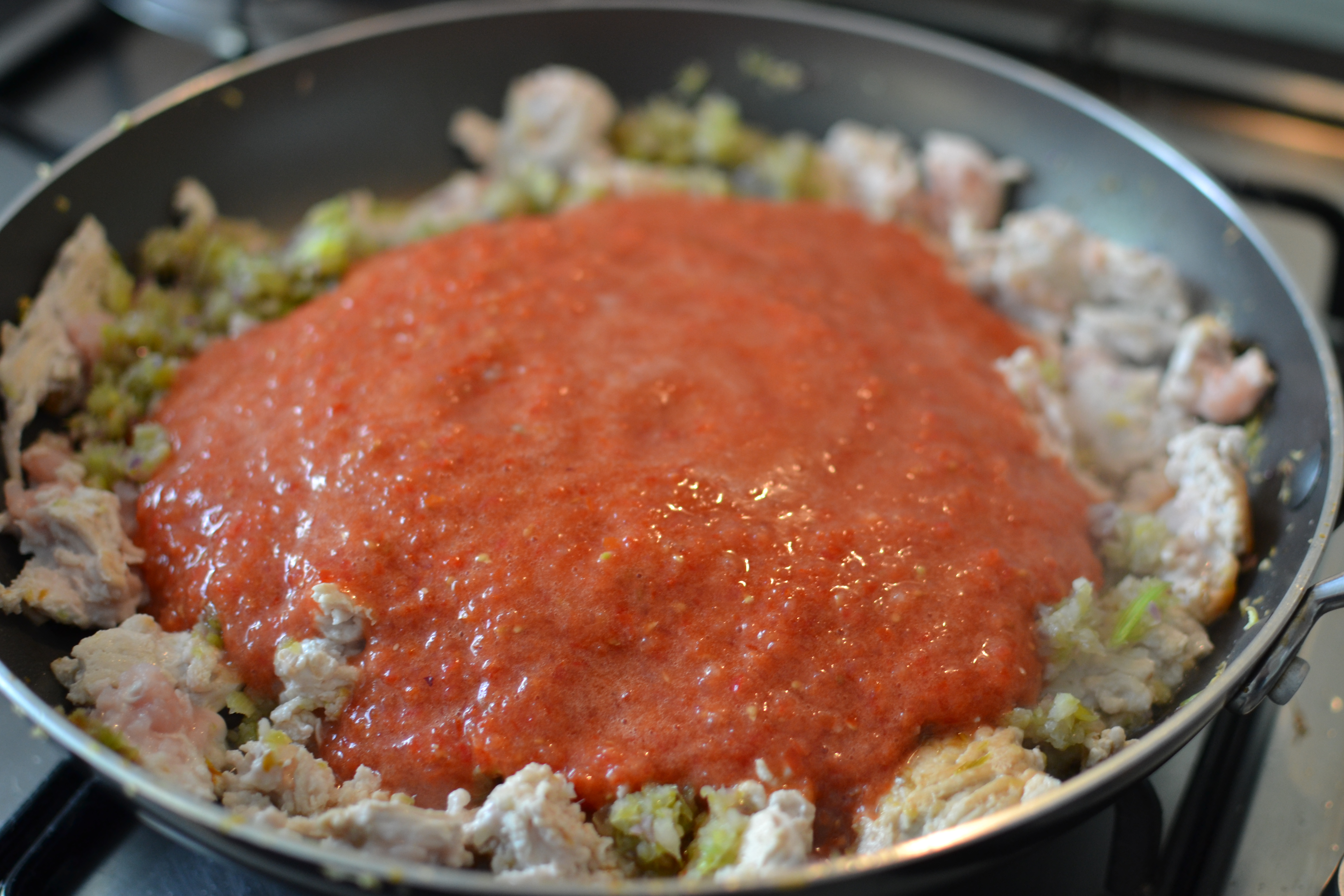 When the turkey is cooked, add the veg and the tomato and pepper sauce. Season generously and add the herbs that you like.