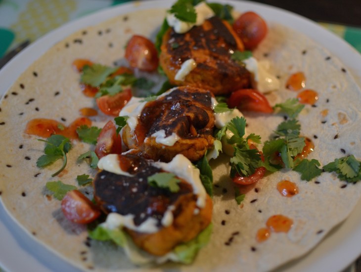 WAY 3. Turn into (slightly misshapen) meatballs and serve in a tortilla with aioli, sweet chilli, coriander and salad