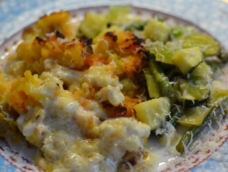 This is a regular feature in my house. I love fish, I love cheese and I love potato so to have them all together… Well… My sister Jan does a lovely and fancy version, poaching the fish in milk first, and adding boiled eggs and other such witchcraft. My version is for simpletons like me. It has creamy mash, with potato skin on for texture (and ease). It uses sweet potato which gives the mash a flavour twist. Use whatever fish you like, and dial the cheese up or down according to taste.
