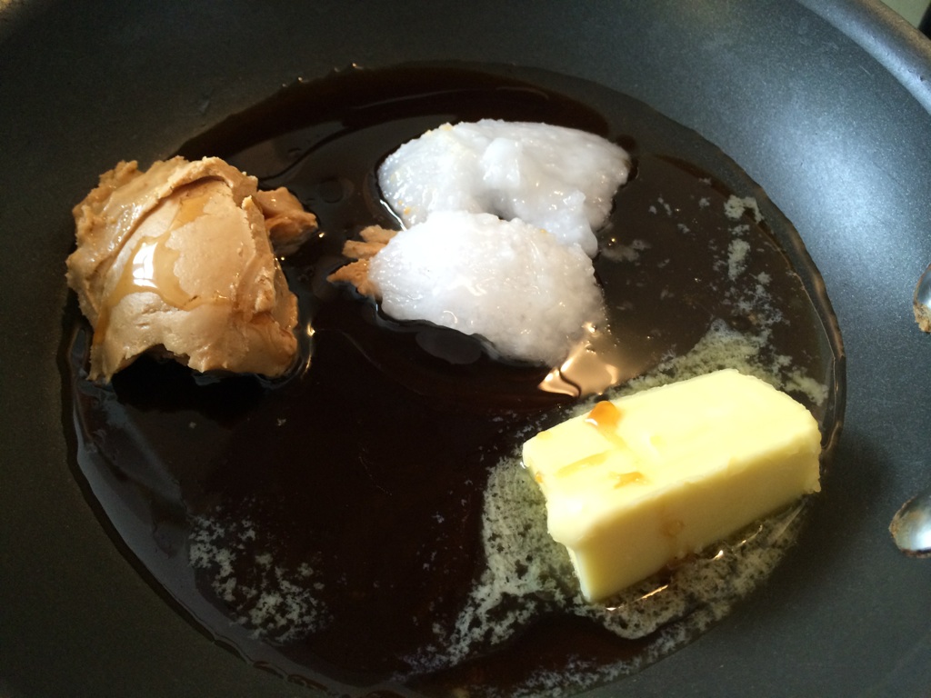 With the seeds and apricots, I put them into a bowl and covered with boiling water. For the seeds it was to soften them a little before baking to stop them going really hard, and with the apricots just to revive and soften them a little. Once you’ve left them for 5-10 minutes, scoop them out but keep the water as this can be used in the mix. Gently warm the butter, cashew nut butter, coconut oil and maple syrup in a non stick pan. You’ll need to stir it quite hard to encourage the cashew butter to break down and mix in with the rest – it might look a bit odd, don’t worry about it.