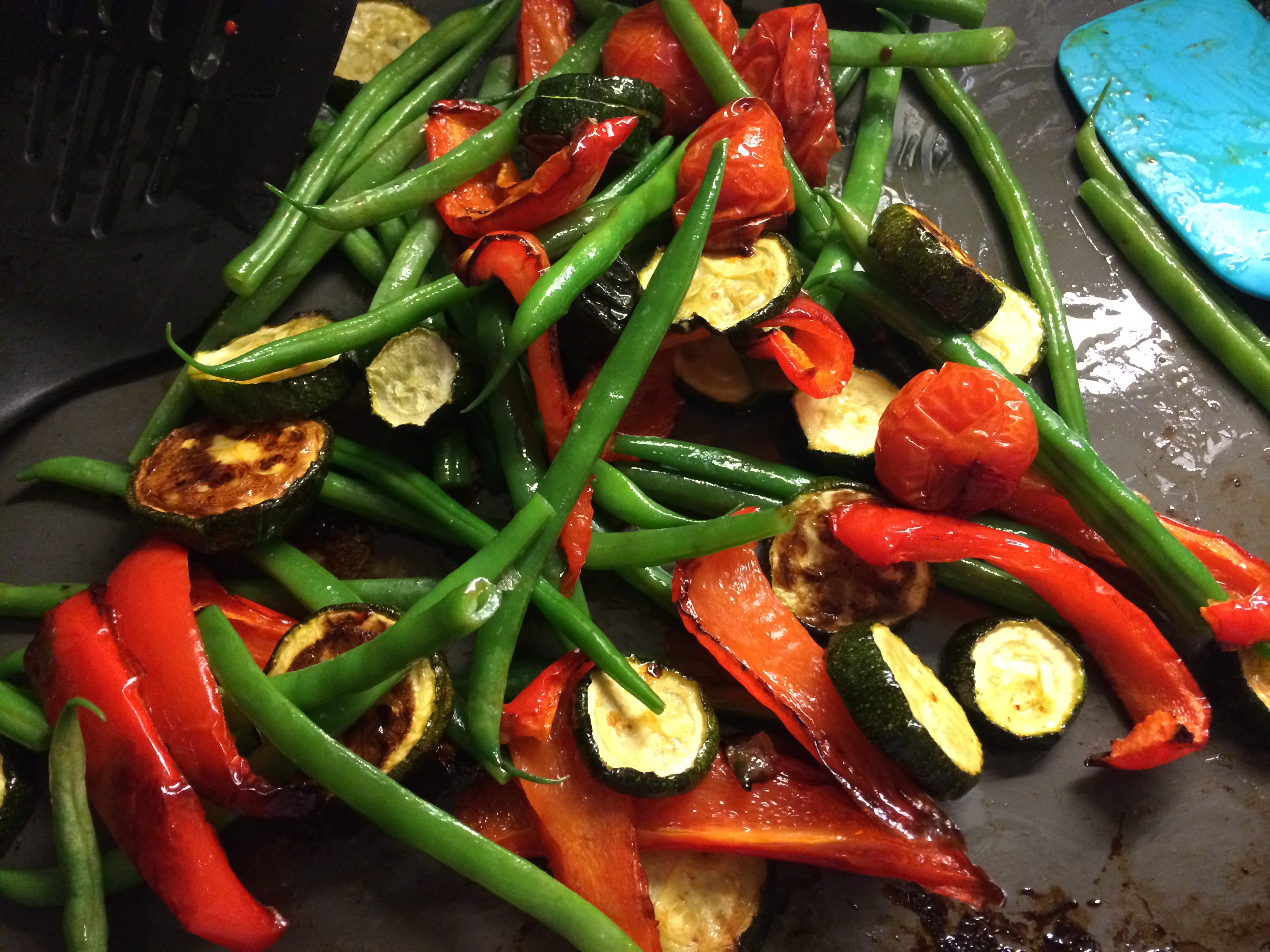 Roast your veg in a drizzle of olive oil for 25 minutes at 180C. Blanche your beans for a minute or so, drain and then mix in with the roasted veg to coat in their juices.