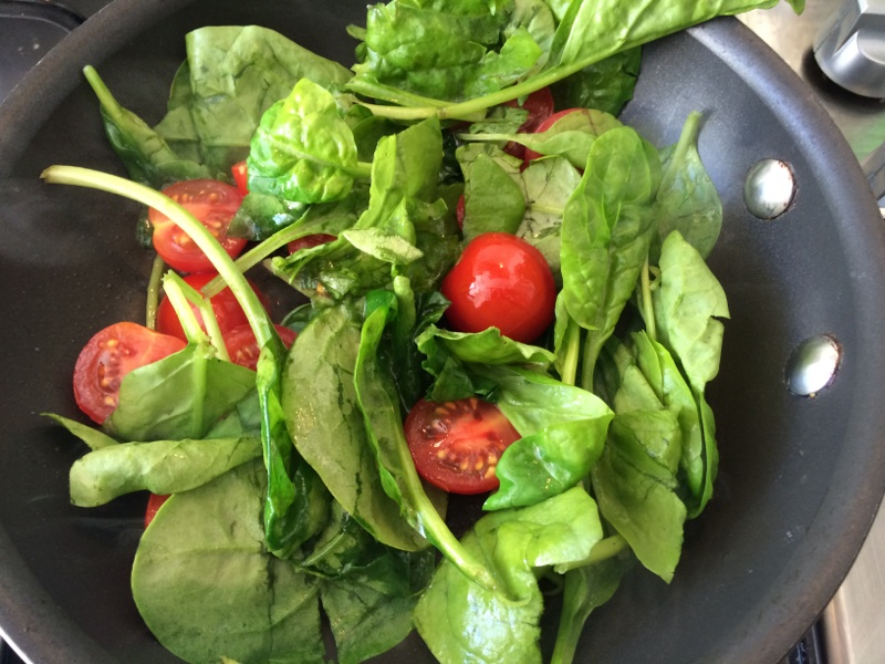 Wash the spinach and with water still clinging to it, add to the pan and wilt.