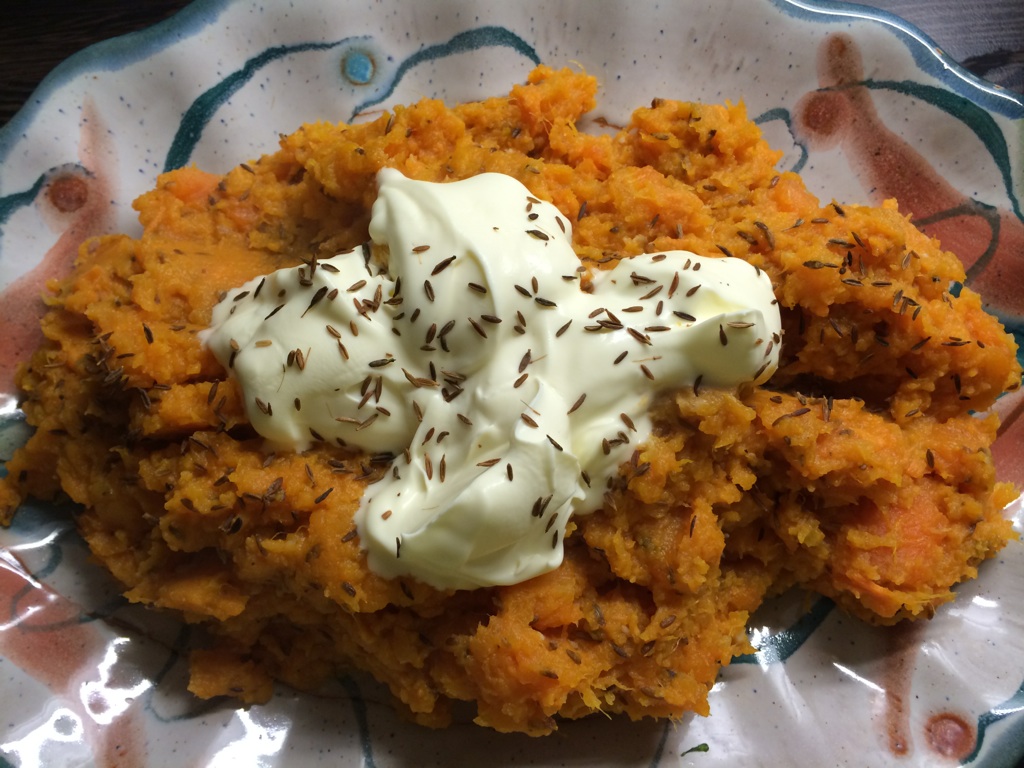 Peel and boil all three ingredients until soft. While they are boiling, toast a large handful of cumin seeds in a non-stick frying pan (approx 4 mins on a medium heat until they start to smoke) and set aside. When the potatoes and carrots are soft, drain and then mash with a big knob of butter (or olive oil) and a big pinch of salt and pepper, then stir in the cumin seeds, saving some to sprinkle on top. I served with a dollop of sour cream.