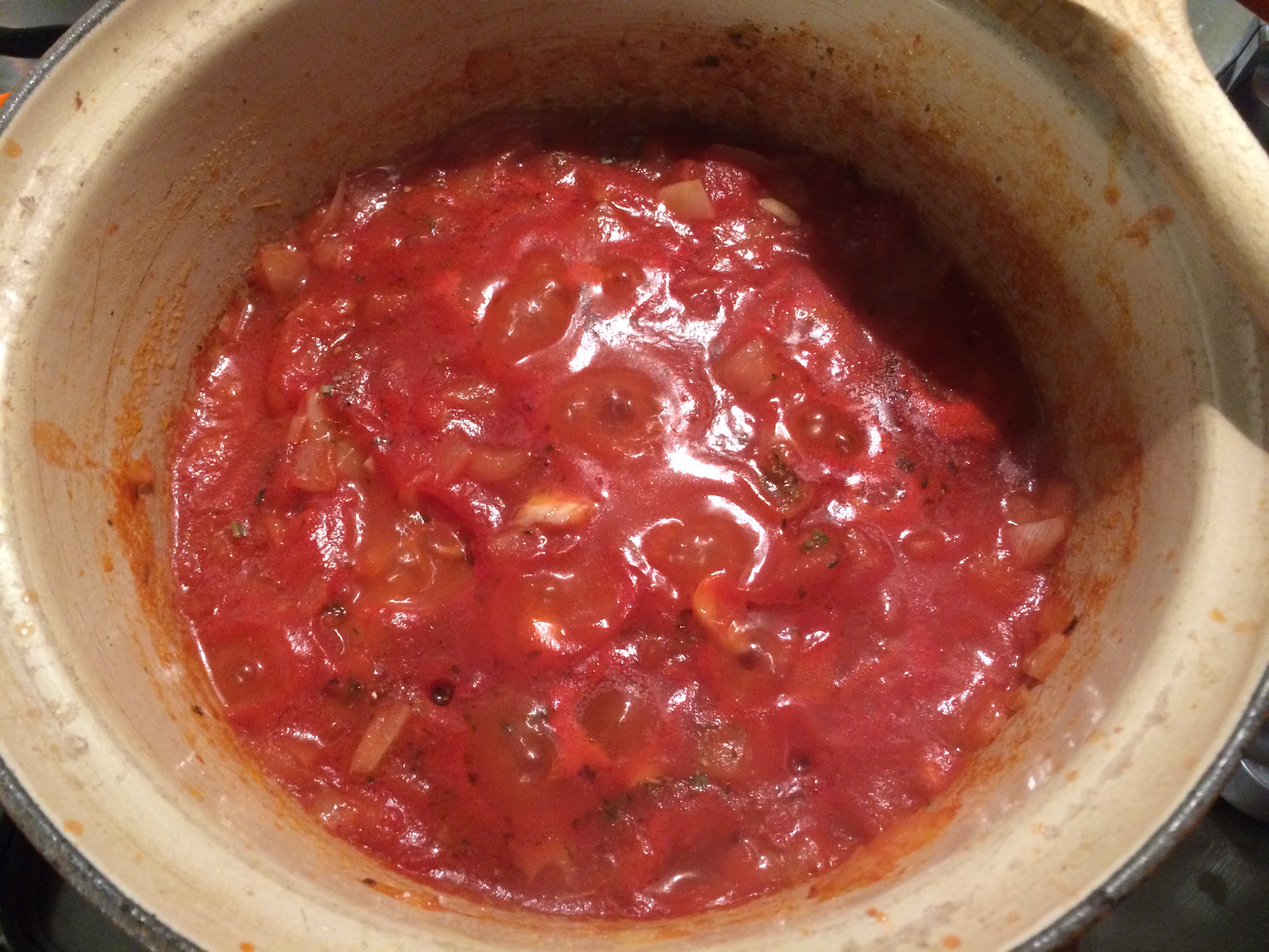 First I put the sauce on to cook. Chop a white onion into small pieces and sweat in some olive oil until translucent. You don’t have to add onion, but I like it. Add a couple of cloves of crushed garlic and cook for a minute. Add a tin of tomatoes, and a couple of good pinches of herbs, bring to a bubble, then turn the heat down and leave it to blip for at least 20 minutes. You want the sauce to reduce down so it’s thick enough to spread on the pizza base, and so that the flavour intensifies. Keep an eye on it and stir now and again. Taste and season – you can also add sugar and salt to intensify the flavour further.