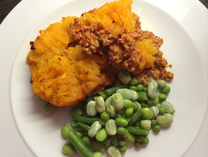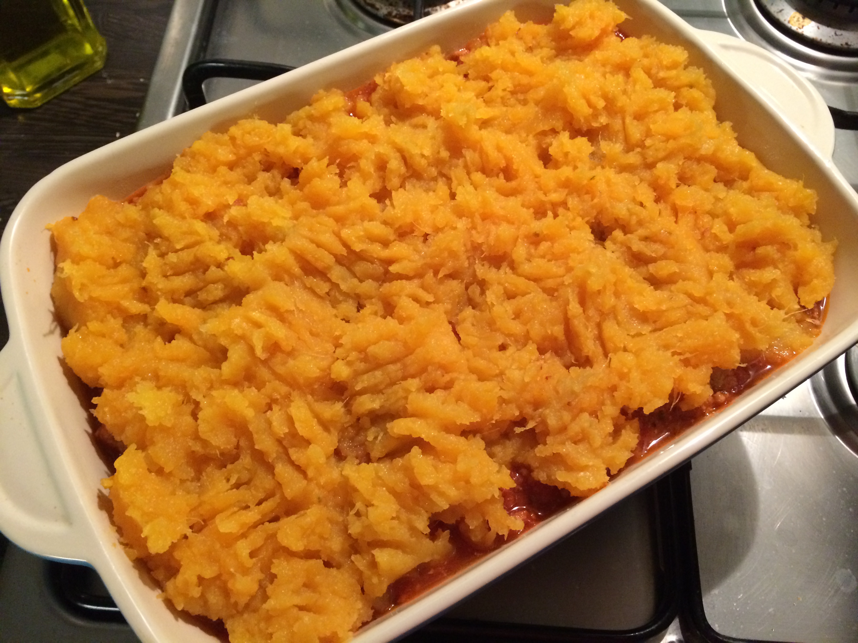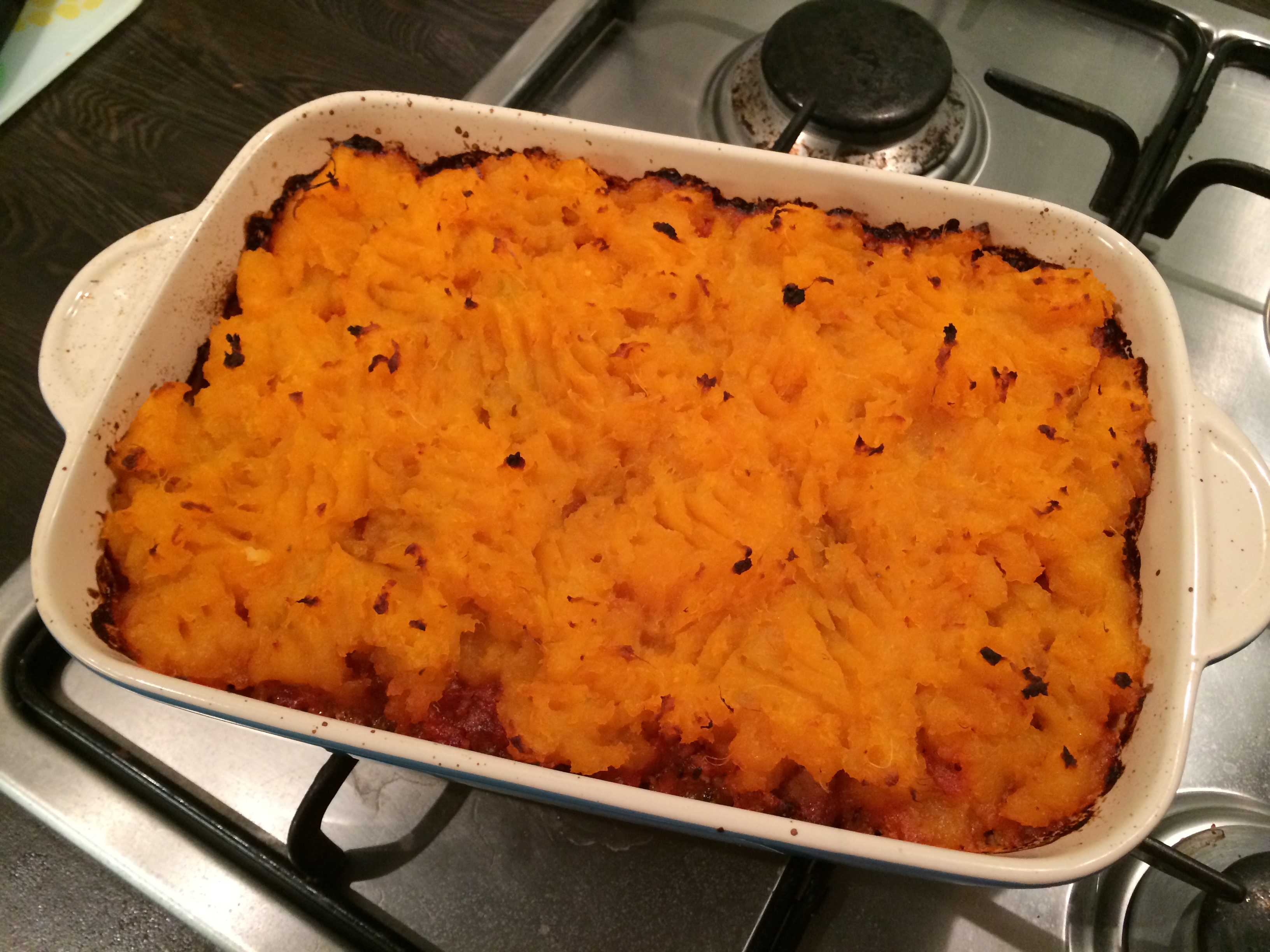 How to make winter comfort food, without red meat, white potatoes, pasta etc etc blah? Answer – quorn or turkey mince, tomatoes, sweet potatoes. (Interestingly, to me, quorn has as many calories per 100g as 5% fat beef mince… 104 calories.)