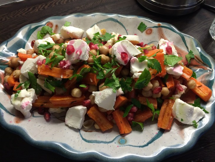 Put the carrots and chick peas onto your serving dish, then crumble over the goats cheese, add the pomegranate and tear over some mint leaves. Add a drizzle more olive oil if you think it needs it.