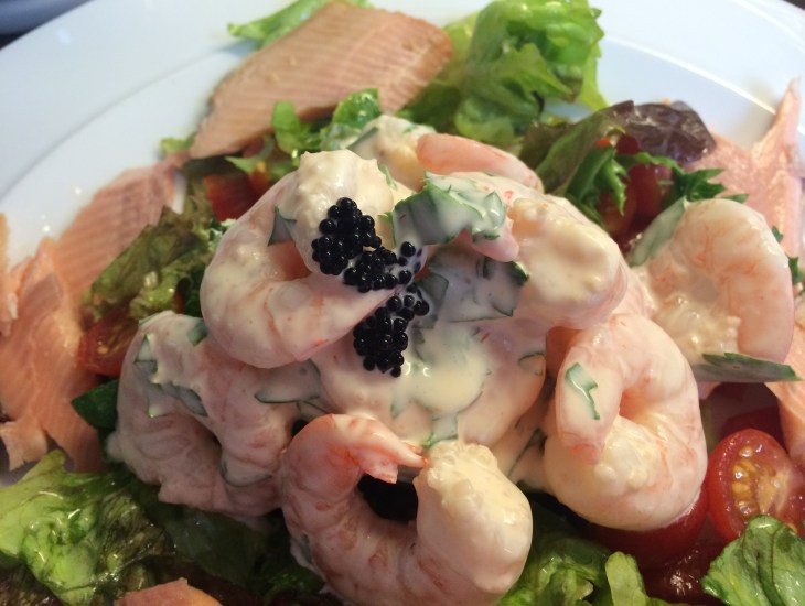 Slice the avocado in half, take out the stone, take a large spoon to remove the flesh from the skin and put in the middle of the salad. Spoon the prawns and sauce into the avocado and top with a bit of caviar.
