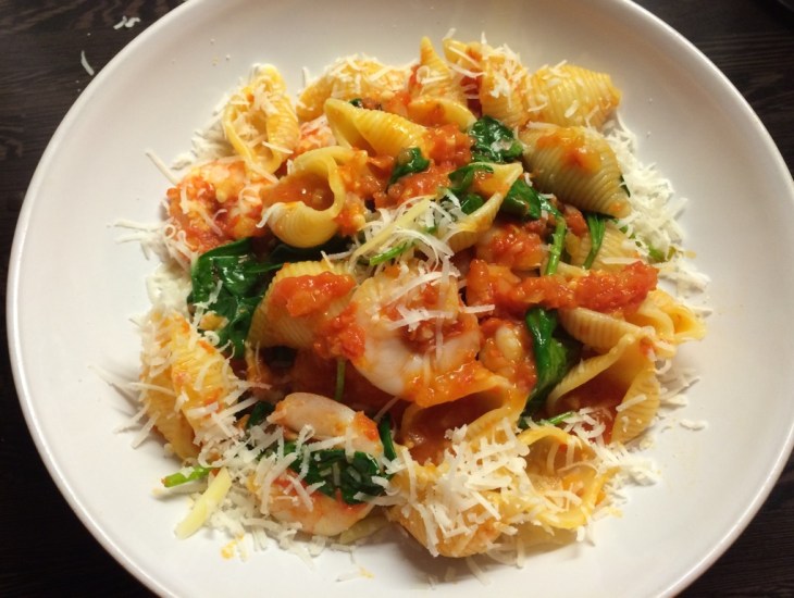 About 8 mins into the pasta boil, add the prawns into the sauce to heat through. Bring the temperature of the sauce pan back up if you need to to make sure they’re heated through. Taste at this point and season as needed.