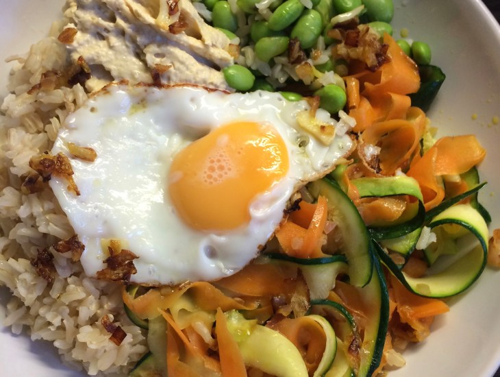 Fill the bowl with the rice, the edamame beans, the carrots and courgette. Add a dollop of hummus. Top with the fried egg and add soy sauce to taste.