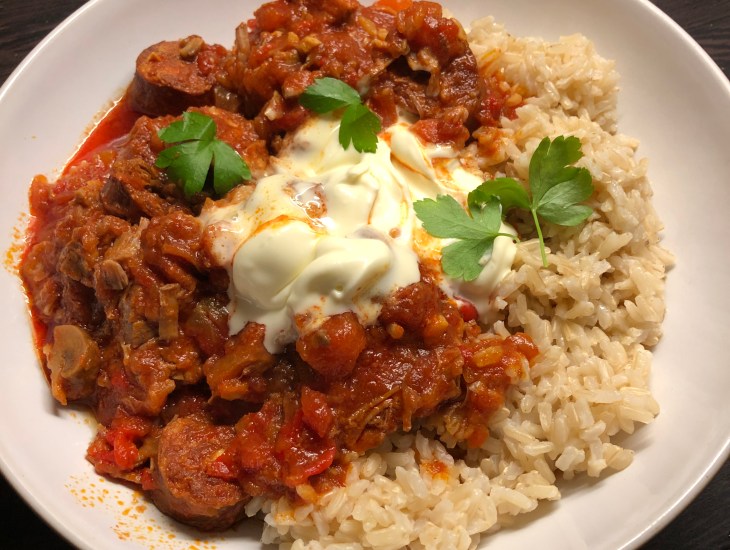 This was a practice-run paprika pork and chorizo goulash and was served with brown rice and sour cream.