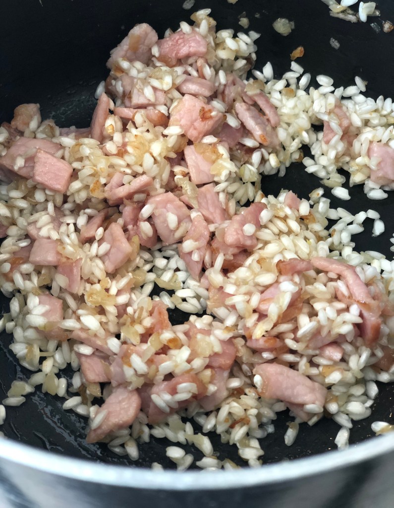 Add the rice to the pan and stir for a couple of minutes, coating it in the fat. It should start to go translucent.